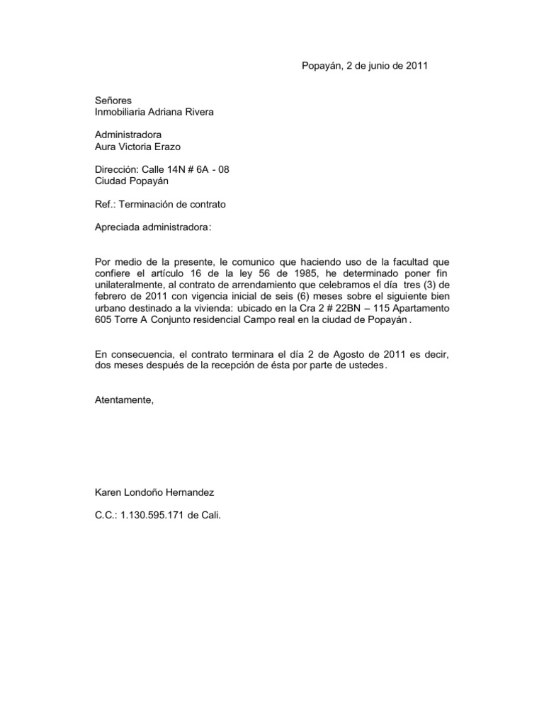 Labace Formato De Carta De Terminacion De Contrato De Arrendamiento