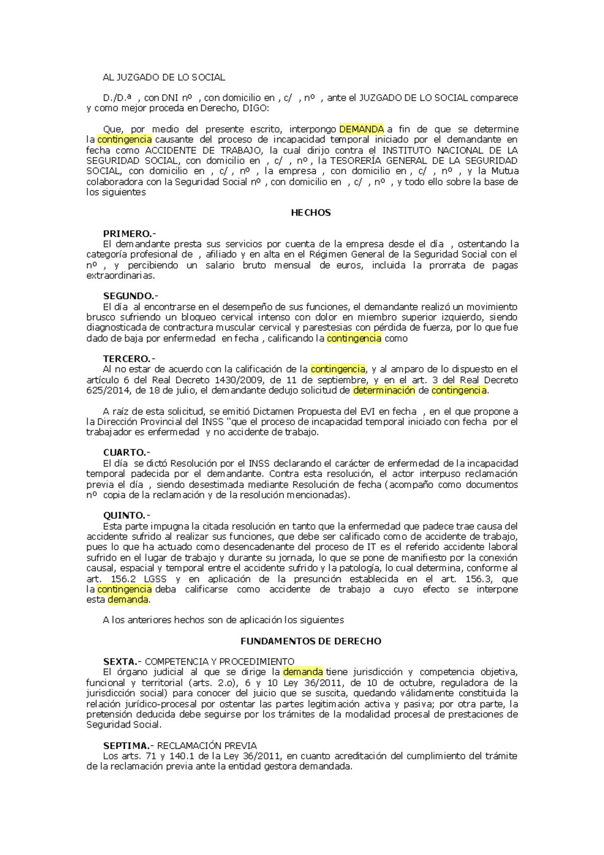 Demanda ante los juzgados de lo social y procedimiento en los juzgados. La activa corresponde al trabajador en atencin a lo previsto en el art. Modelo demanda disconformidad impugnacin alta mdica.