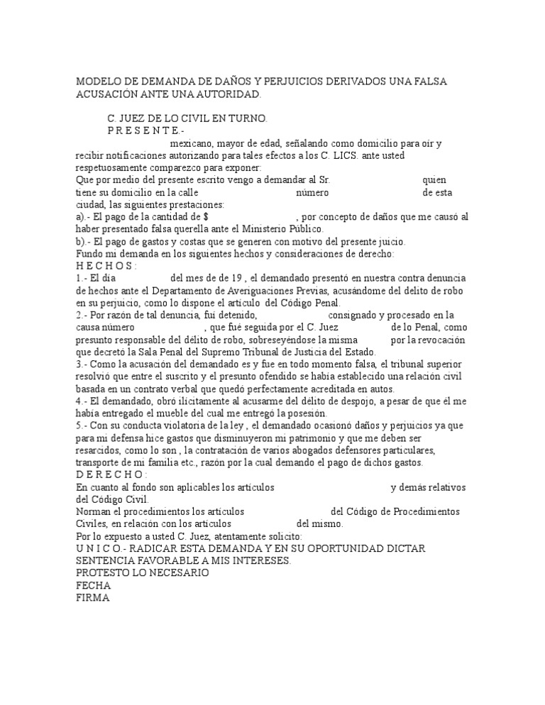 Modelo De Demanda De Danos Y Perjuicios Derivados Una Falsa A Pdf Demanda Judicial Robo