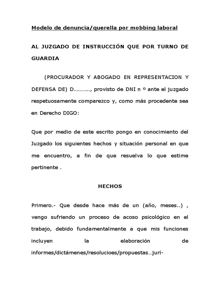 Modelo De Querella Mobbing Laboral Derecho Penal Moralidad